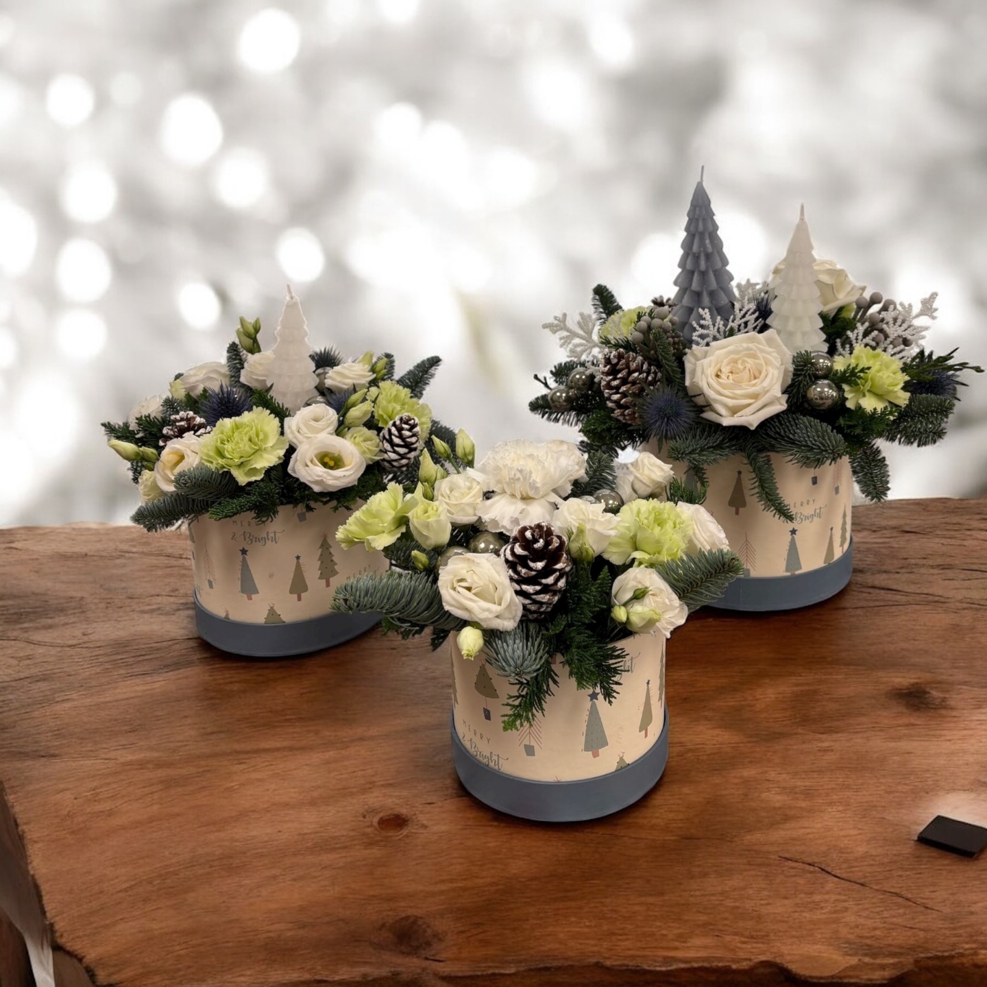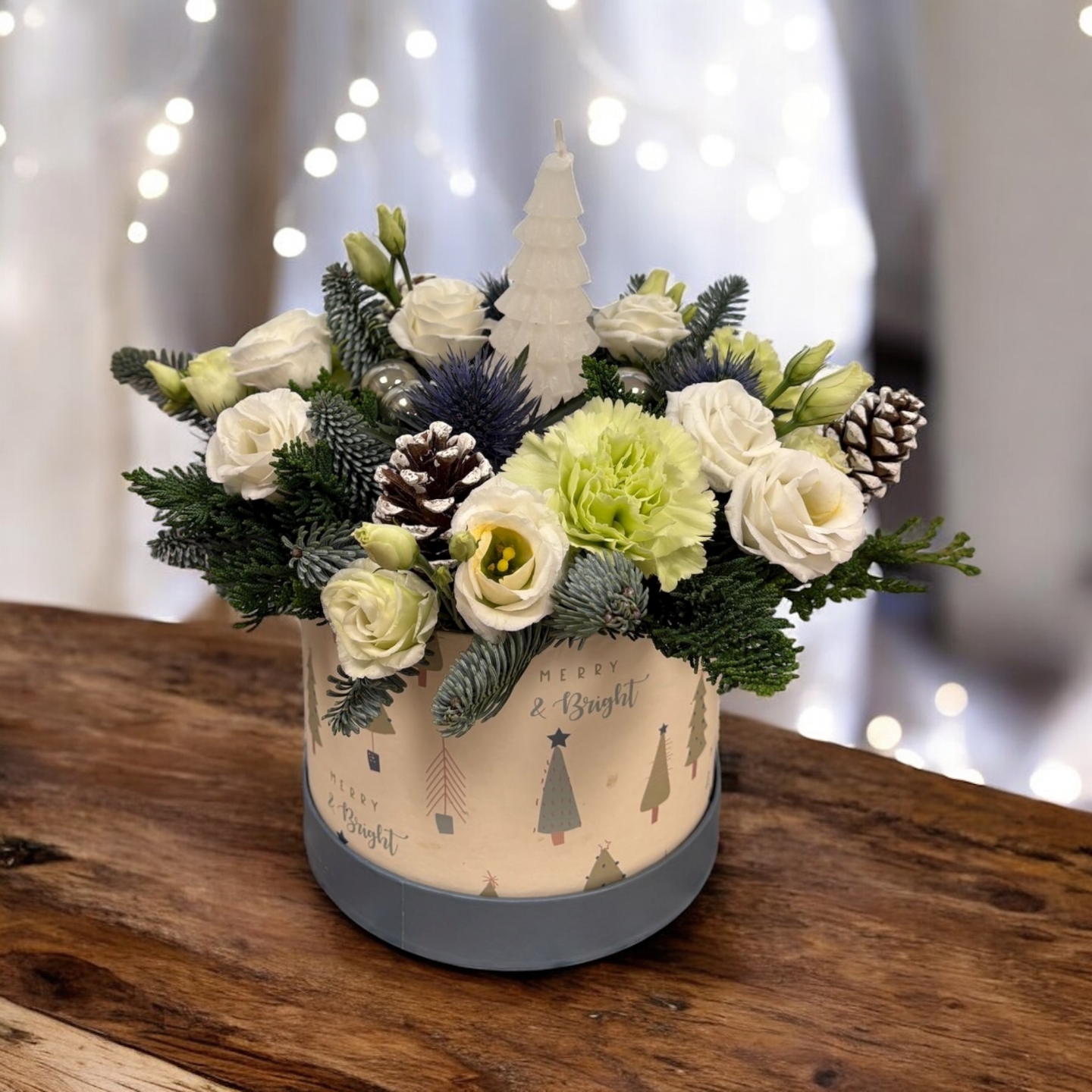 Experience the peaceful charm of winter with Nordic Snowfall. This stunning floral arrangement reflects the serene beauty of a snowy Scandinavian scene, combining lisianthus, soft green carnations, thistle, pine cones, and fragrant evergreens. A delicate white tree candle adds the finishing touch, all beautifully displayed in a Nordic-inspired hatbox. Ideal as a thoughtful gift or a striking centrepiece, Nordic Snowfall adds a touch of frosty elegance to your holiday décor.
