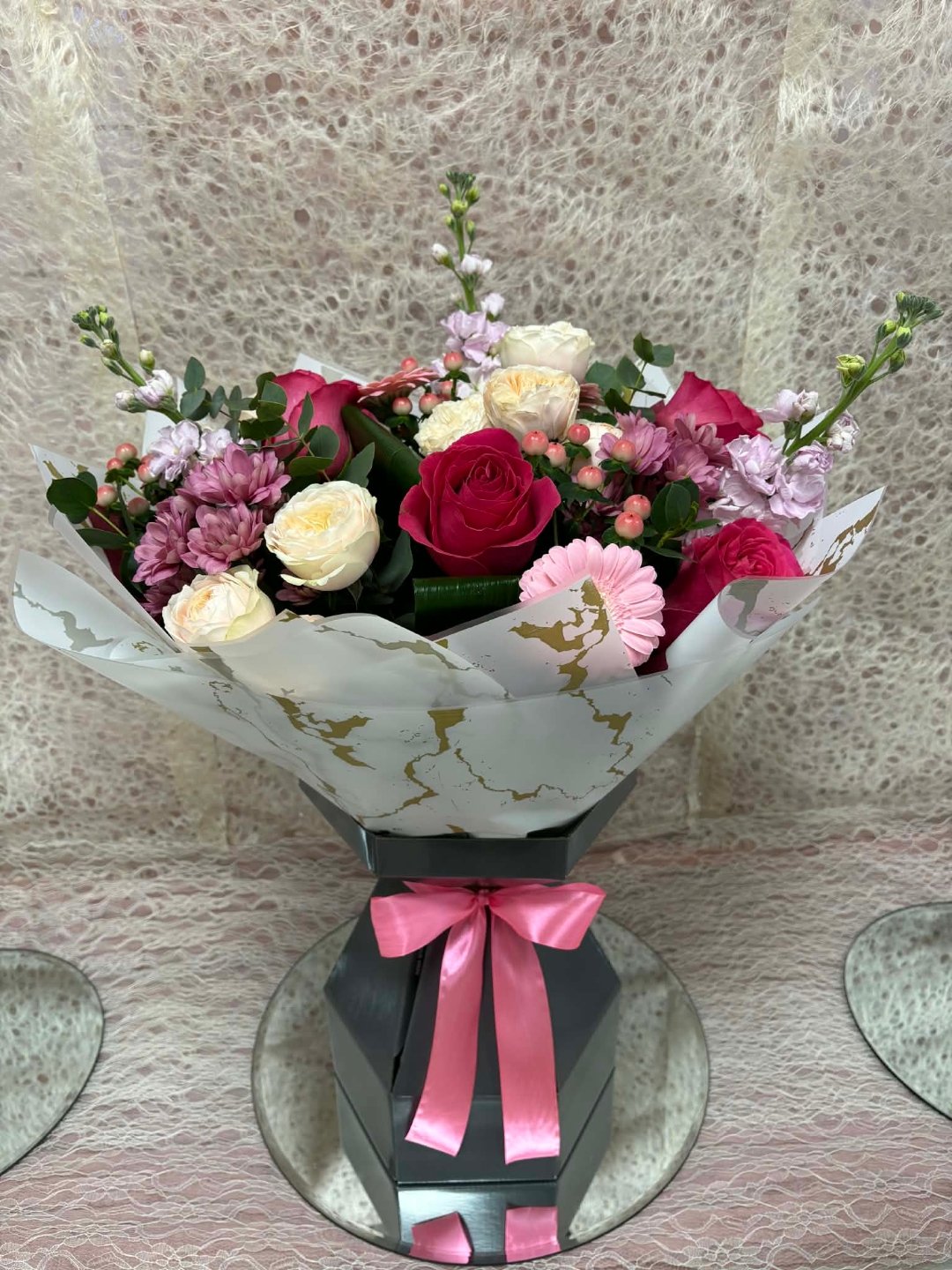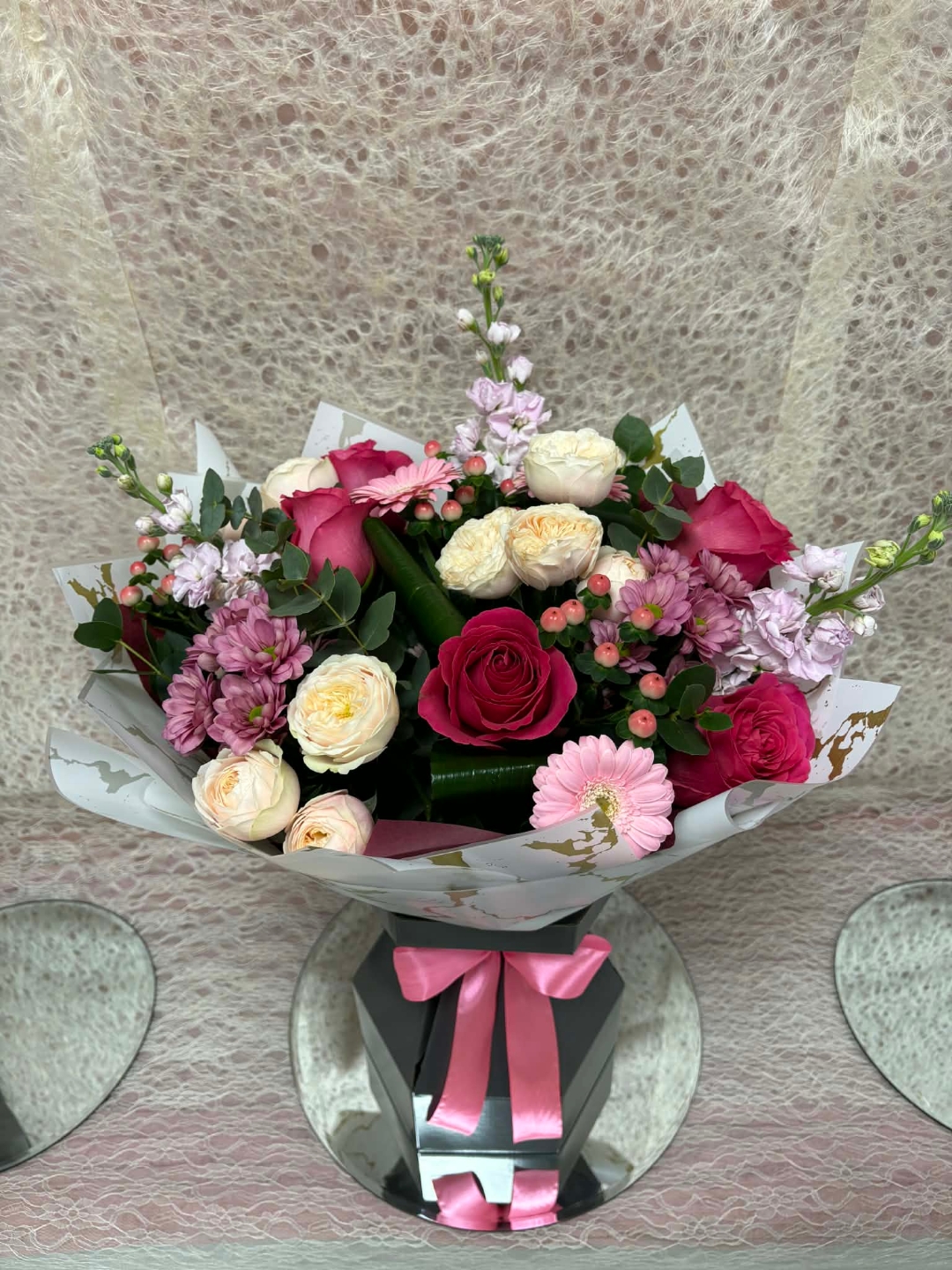 Blushing Promises is a heartfelt bouquet filled with warmth, romance and gentle charm. Featuring deeply fragrant cerise roses with a rich, nostalgic scent, reminiscent of traditional garden roses, alongside soft cream garden roses, blush pink gerberas and delicate seasonal blooms, this arrangement blends expressive colour with feminine texture. Accented with fresh eucalyptus and finished in elegant wrapping tied with a satin pink ribbon, it feels thoughtful, luxurious and full of emotion.