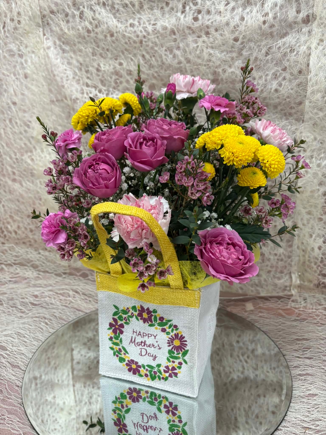 Presented in a charming keepsake Mother’s Day gift bag, this arrangement is full of colour, warmth and heartfelt appreciation — the perfect little surprise to brighten Mum’s day and remind her how much she is loved.