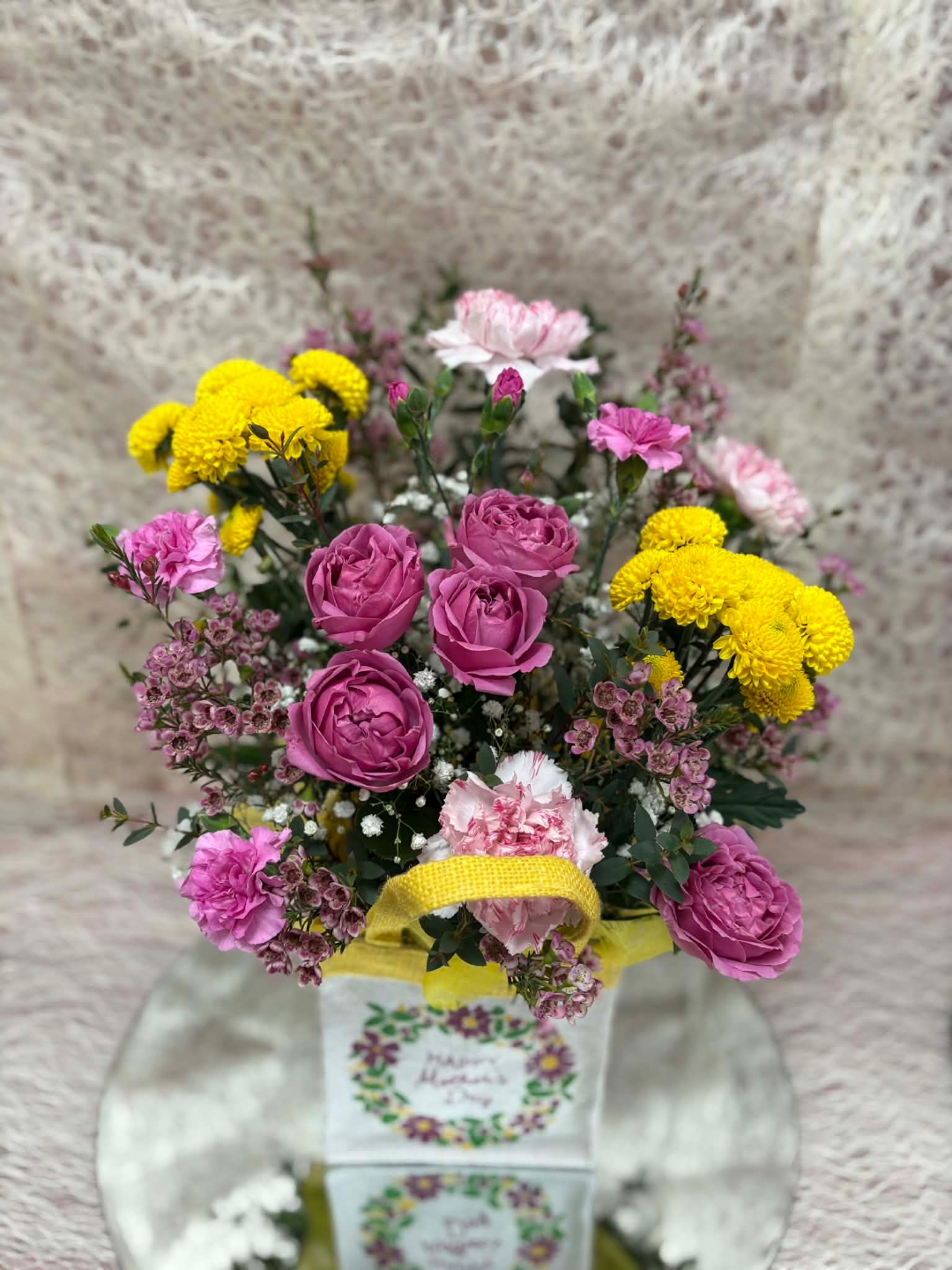 Mum’s Happy Moment is a cheerful Mother’s Day arrangement designed to bring an instant smile. Bursting with vibrant pink roses, sunny yellow chrysanthemums, soft pink carnations and delicate waxflower, this joyful design is beautifully balanced with fresh seasonal foliage for a soft garden feel.