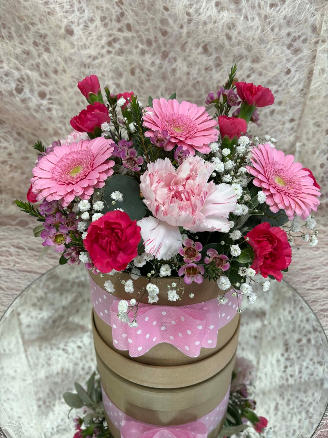 Mum’s Pretty in Pink is a sweet and feminine hatbox arrangement designed to make her smile this Mother’s Day. Featuring soft pink germinis, delicate carnations, vibrant cerise blooms and clouds of gypsophila, this charming design is beautifully softened with fresh seasonal foliage for a light, airy finish.